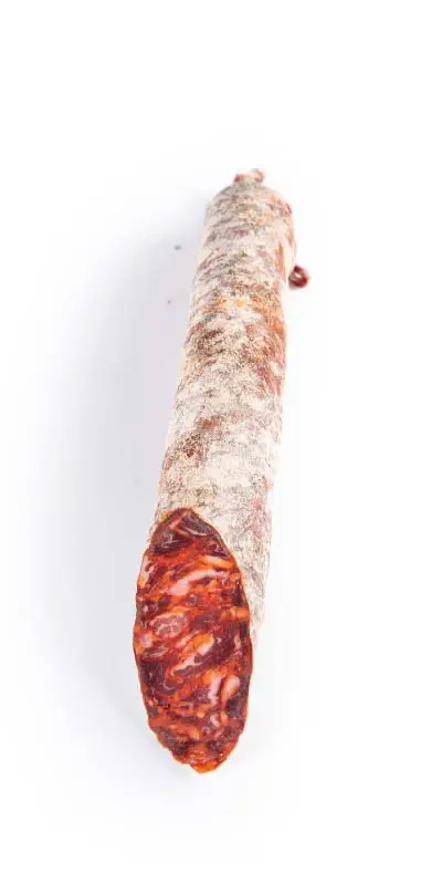 - Ingredientes: Carne y grasa de cerdo ibérico, sal, pimentón, ajo, orégano, dextrosa, dextrina, conservadores (E-250, E-252), aceite vegetal, proteína de cerdo, fibra vegetal y aroma.